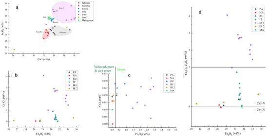 Chemical determination binary diagram that allows the determination of demantoids from Baluchistan, Pakistan (PA), Namibia (NA), Russia (RU), Italy (IT), Iran (IR 1 and IR 2), Madagascar (MA) [2,6,7]. (a) CaO–Fe2O3 binary diagram; (b) Fe2O3–Cr2O3 binary diagram; (c) Cr2O3–V2O5 binary diagram; (d) Fe2O3-[Cr2O3 –V2O5] binary diagram.