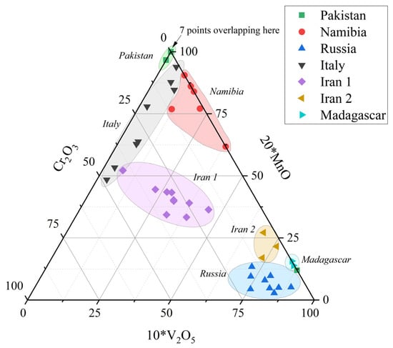 Chemical determination ternary diagram for worldwide demantoids. Cr–V–Mn ternary diagram that allows the determination of demantoids from Baluchistan, Pakistan (PA), Namibia (NA), Russia (RU), Italy (IT), Iran (IR), Madagascar (MA) [2,6,7]. To enhance the clarity and precision of the outcomes displayed on the ternary diagram, the data of V2O5 were amplified by a factor of 10, whilst those of MnO underwent a multiplication of 20.