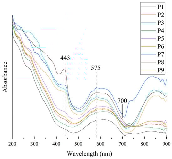 In general, demantoids produced from serpentinite typically exhibit distinct absorption bands of Cr3+ in their spectra, contributing to their characteristic spectral features in the 500–700 nm range [3]. The Cr content in the samples of this study is low, generally below the detection line of EDXRF. Nevertheless, the feature absorption spectrum of Cr remains visible, which may be attributed to the inherent limitations of EDXRF in achieving high detection accuracy. In addition, the intensity of some characteristic absorption is weaker compared to the strong absorption that should be exhibited by the element content in this study, such as the absorption at 443 nm, which should have been sharp and intense, and it is the most characteristic and diagnostic feature in the demantoid spectrum. The relatively smooth surface of the sample may affect the scattering during the testing process, leading to these differences.
