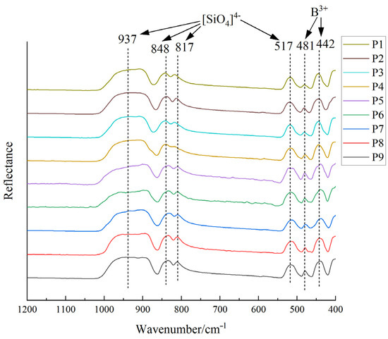 The infrared spectrum results are presented in Figure 9. The absorption peaks observed at 937 cm−1, 848 cm−1, 817 cm−1, and 517 cm−1 in the sample correspond to vibrations related to [SiO4]4− units in the demantoid [31,34]. Additionally, the absorption within the range of 400–500 cm−1 is formed by trivalent cations entering the [BO6] lattice (octahedral coordination formed by B3+) [35].
