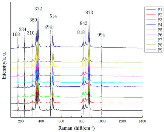 Regarding Raman spectroscopy, Figure 10 illustrates the spectral characteristics of the samples. In the spectra, distinct peaks are observed at 873 cm−1, 843 cm−1, 818 cm−1, 514 cm−1, 372 cm−1, and 350 cm−1. Weak peaks are also present at 994 cm−1, 310 cm−1, 234 cm−1, and 168 cm−1. Specifically, the absorption peaks near 994 cm−1, 843 cm−1, and 818 cm−1 are related to (Si–O)Str vibrations (Si–O stretching vibration), while the peaks near 514 cm−1 and 494 cm−1 are related to (Si–O)bend vibrations (Si–O bending vibration) [36]. The absorption peaks near 350 cm−1 and 310 cm−1 are associated with the rotation of SiO4–R(SiO4)4− vibrations, the peak near 168 cm−1 is related to the translation of SiO4–T(SiO4)4− vibrations, and the peak near 234 cm−1 corresponds to the translation of X2+–T(X2+) vibrations (X2+ represents divalent ions) [29].