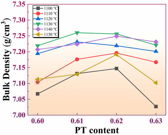 The bulk density of ceramics can reflect the density of ceramic samples after sintering, and can reflect the compactness and porosity of the internal grain arrangement of ceramic samples to a certain extent. Figure 1 shows the density of ceramic samples at different sintering temperatures. It can be seen from the diagram that the density of the ceramic sample increases first and then decreases with the increase in the sintering temperature under the same component, and the maximum value is obtained at 1130 °C. Therefore, we choose 1130 °C as the best sintering temperature for PYN-BS-PT ceramics.