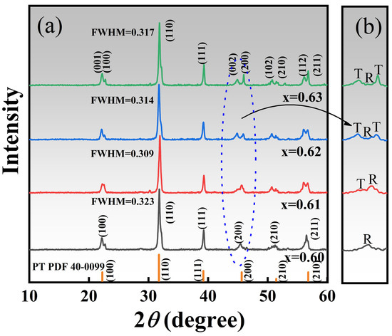 Figure 2a presents the XRD pattern of PYN-(0.975x)BS-xPT (PYN-BS-xPT) piezoelectric ceramics, and Figure 2b presents the {200} peak amplification diagram of PYN-BS-xPT ceramics, where R represents the rhombohedral phase and T represents the tetragonal phase. It can be observed that all the samples show a perovskite structure without the presence of a second phase, indicating that the third component PYN has completely entered the BS-PT system and formed a steady solid solution. With the increase in PT content, the lattice symmetry of PYN-BS-xPT piezoelectric ceramics gradually changed. When x = 0.60, the (200) diffraction peak of the PYN-BS-xPT ceramic is a single diffraction peak, indicating that the x = 0.60 ceramic has an R phase. With the increase in PT content, the (200) peak gradually widens and splits, and completely splits into two diffraction peaks (002)/(200) in the x = 0.62 ceramic, indicating that the phase structure of the PYN-BS-xPT ceramic shifted from an R phase to a T phase [28]. As shown in Figure 2b, when x < 0.61, the material is a rhombohedral phase; when x > 0.61, the material is a tetragonal phase. When x = 0.61, the material is in a two-phase coexistence state—that is, there is a morphotropic phase boundary region, which is beneficial for obtaining high dielectric and piezoelectric properties. This is different from the MPB region of the pure (1x)BS-xPT system located at x = 0.64, due to the introduction of Yb3+and Nb5+ cations in the PYN system which replace the Sc3+and Ti4+ ions, resulting in a slight shift in the MPB region [29].
