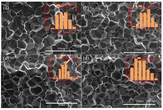 SEM micrographs of the PYN-BS-xPT ceramics: (a) x = 0.60; (b) x = 0.61; (c) x = 0.62; (d) x = 0.63. The insets show the grain size distribution of the ceramics.