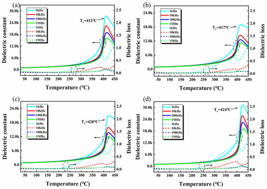 Figure 4 shows the dielectric constant and dielectric loss of PYN-BS-xPT ceramics at different temperature and frequencies. It can be seen that the dielectric constant has a dielectric anomaly at the ferroelectric to paraelectric phase transition point—that is, the Curie temperature [31]. The Curie temperature of PYN-BS-xPT ceramics increases linearly with the increase in PT content, from 412 °C for x = 0.60 to 424 °C for x = 0.63, which is slightly lower than that of the BS-PT solid solution, indicating that the introduction of PYN will decrease the Curie temperature of BS-PT ceramics [32]. At the same time, the dielectric temperature spectrum of PYN-BS-xPT ceramics shows a significant broadening peak, and the degree of broadening with the increase in PT content gradually decreases. As a typical relaxor ferroelectric end member, PYN is introduced into the BS-PT binary system to enhance its relaxor properties, which can be demonstrated by the dielectric temperature spectrum at different frequencies, as shown in Figure 4b. The dielectric constant of PYN-BS-0.61PT ceramics shows a relatively wide peak and the Curie temperature gradually moves in the high-frequency direction. All of the results show that the incorporation of PYN provides the ternary PYN-BS-0.61PT ceramics with relaxor characteristics, as a typical perovskite-type relaxor ferroelectric. This result is mainly due to the unequal substitution of Yb3+ and Nb5+ ions, which destroys the balance of the internal valence, may lead to chemical heterogeneity and structural disorder, and finally causes the relaxation behavior of PYN-BS-0.61PT. The dielectric loss shows the same trend as the dielectric temperature. When x = 0.61, the dielectric loss at room temperature decreases from 0.05 to only 0.0149. Compared with the doped BS-PT binary piezoelectric ceramics, the dielectric loss is greatly improved [33]. This shows that the doped ternary system piezoelectric ceramics can better meet the application requirements.