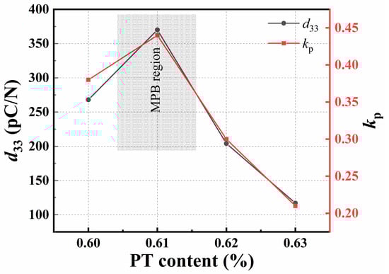 Figure 5 shows the piezoelectric coefficient d33 and planar electromechanical coupling factor kp of PYN-BS-xPT piezoelectric ceramics, and the kp is calculated based on the following formula:
