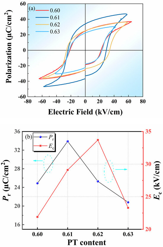 Figure 6a displays the P–E loops of PYN-BS-xPT peizoelectric ceramics. It can be observed that all samples show a saturated P–E loop without obvious leakage behavior. The remanent polarization Pr and coercive field Ec are extracted as shown in Figure 6b. The Pr increases with the increase in PT content, reaching a maximum value of 33.9 μC/cm2 at x = 0.61, and then gradually decreases to 20.8 μC/cm2 at x = 0.63. The highest value obtained for the x = 0.61 ceramic further proves that it is located in the MPB region. Compared with the unmodified BS-PT binary system, Pr is greatly improved, which proves that the introduction of PYN optimizes the ferroelectric properties of BS-PT.