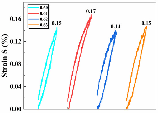The electric field-induced strain of the piezoelectric material is an important parameter in the design of the actuator, which comes from the intrinsic contribution provided by the inverse piezoelectric effect and the extrinsic contribution caused by the domain wall motion [37]. Figure 7 presents the electric field-induced strain curve of the PYN-BS-xPT ceramic. The larger the electro-induced strain is, the larger the driving displacement under the same voltage is. In this experiment, all ceramic samples maintained good linearity and achieved a maximum strain of 0.17% at room temperature, indicating that the component is very suitable for the design of high-temperature piezoelectric actuators.