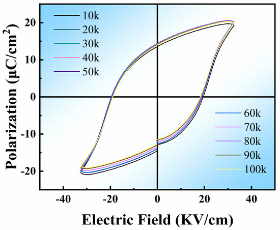 The cyclic stability of ceramics is one of the key parameters for their service life and reliability [38,39]. Figure 8 shows the P–E cycling stability of PYN-BS-0.61PT at room temperature. It can be observed that after 105 cycles, the P–E curve of the ceramic is still in a saturated state, and there is no obvious leakage phenomenon. There is no significant change in the P–E curve compared with the P–E curve before the cycle, which indicates that the PYN-BS-xPT ceramics have excellent stability and reliability in long-term use.