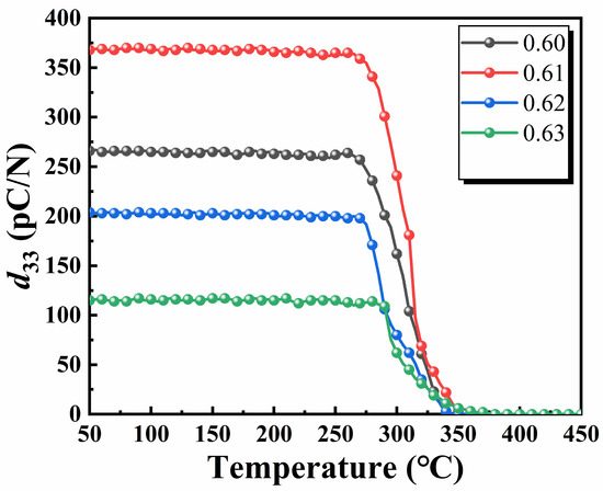 To further explore the temperature stability of piezoelectric properties, the piezoelectric d33 of PYN-BS-xPT ceramics at different annealing temperatures was characterized, as shown in Figure 9. All PYN-BS-xPT ceramic samples exhibited a stable d33 with the increase in annealing temperature, and this decreased sharply after reaching the depolarization temperature. It is worth noting that the PYN-BS-0.61PT ceramic with a high piezoelectric d33 = 370 pC/N displayed no significant attenuation in the range of room temperature to 290 °C, showing its potential for application in piezoelectric devices with variable temperature [40].