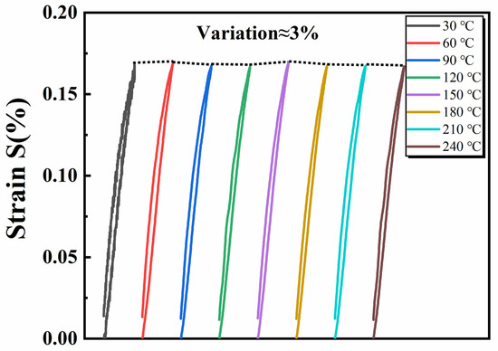 In order to further study the strain–temperature stability of PYN-BS-xPT ceramics, we measured the field-induced strain of ceramic samples with x = 0.61 in the temperature range of 30 °C–240 °C. The measurement results are shown in Figure 10. It can be seen from the diagram that the change rate of field-induced strain of the ceramic sample with temperature is about 3%, showing good temperature stability. In summary, the temperature stability of PYN-BS-xPT is much higher than that of commercial ceramics such as PZT 5H, PZT 4 and PNN-PZ-PT, and it is an ideal material for application in the field of wide-temperature-range and high-performance piezoelectric actuators.