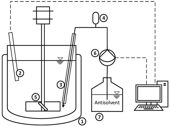 Setup of fed-batch antisolvent crystallizer with 300 mL starting volume: (1) Crystallizer with temperature jacket, (2) temperature probe, (3) antisolvent injection nozzle, (4) pulsation damper, (5) pitched blade stirrer with four blades, (6) membrane pump, (7) antisolvent storage tank.
