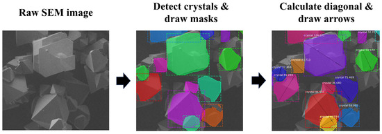 Mask R-CNN detects crystals on SEM images and draws masks. From the information on the masks, the longest diagonal is calculated for each crystal.