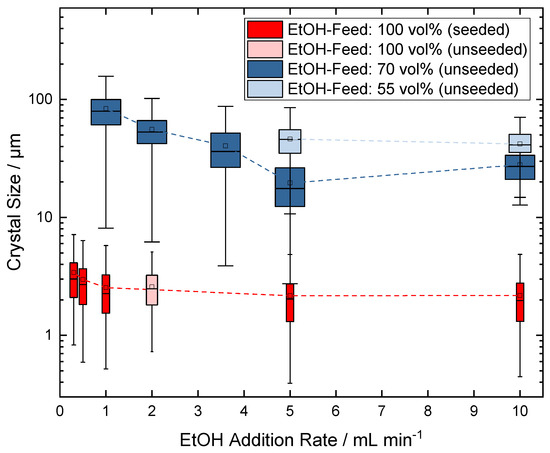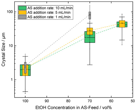 The antisolvent addition rate is varied to study its influence on the CSD at the end of each experiment when the ethanol concentration of 6 mol L−1 is reached. The overview of CSDs for experiments with variations in antisolvent dilution and addition rate is given in the box-plot diagram in Figure 4. The box-plot markers are plotted over the corresponding pure ethanol addition rate for better comparison, although the real addition rate is higher for diluted antisolvent feed solutions due to the simultaneous introduction of water into the system.