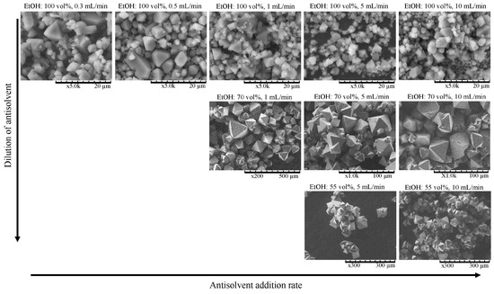 To give an impression of the crystals not only in numbers but in form and appearance one SEM image of each experiment’s final sample is presented in Figure 6. Notice that the magnification changes from 5000-fold for the smallest crystals with 100 vol% ethanol addition to ranges from 1000 to 200-fold magnification for the larger crystals. Slight changes in size and appearance are noticeable in the 100 vol% row. The crystals from slower antisolvent addition rates have larger surfaces and the triangular shape of the faces becomes more visible although the corners are often not grown out. That influences the appearance and number of faces of the crystals. It appears, however, that the crystal habit, meaning the ratio of spacial dimensions of the crystal stays similar. The larger crystals from 70 vol% and 55 vol% ethanol addition show mostly grown-out corners. They also sometimes grow into or out of each other with a different orientation.