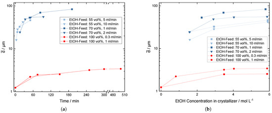 The mean diameter during several crystallization experiments for different addition rates and dilutions of the antisolvent. The change in the mean diameter over time (a). The same values as in (a) but plotted over the ethanol concentration in the crystallizer (b).