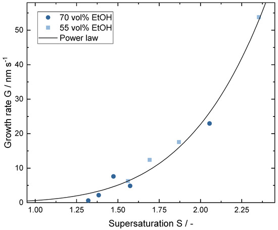 The calculated growth rates based on the mean diameter after Equation (1) are presented in Figure 8. The growth rates are an estimation neglecting any nucleation after the first measured CSD for each experiment, which is reasonable for diluted ethanol addition as shown in the CSDs in the Appendix D Figure A10 and Figure A11. Although secondary nucleation cannot be fully ruled out the CSDs indicate negligible nucleation at ethanol concentrations of 2 mol L−1 and higher. Nucleation can not be neglected in experiments with pure ethanol addition, which are therefore excluded from the analysis of growth rates. The supersaturation is calculated after Equation (4) with measured scandium salt concentrations and SLE data published previously [15]. The highest growth rate can be obtained from 55 vol% with 10 mL min−1 with 53.38 nm s−1. This high growth rate can be explained by a good balance of fast mixing and fast antisolvent addition which generates a high and well-distributed supersaturation. Growth rates from 55 vol% and 70 vol% ethanol addition aline when plotted over the supersaturation. The growth coefficient and the growth rate order g based on the power law after Equation (3) are defined in nm s−1. This approximation fits well with all measured growth rates as shown in Figure 8. The parameters are estimated as 0.6159 nm s−1 and = 5.204 with = 0.9823.