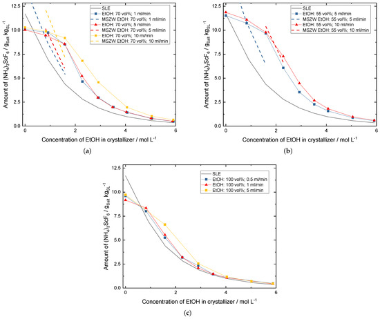 Above a concentration of 4 mol L−1, of ethanol all concentration curves approach the solid-liquid equilibrium (SLE) and reach approximately a tenth of the starting scandium salt concentration. This correlates with the decreasing crystal growth above an ethanol concentration of 4 mol L−1 shown in Figure 7.