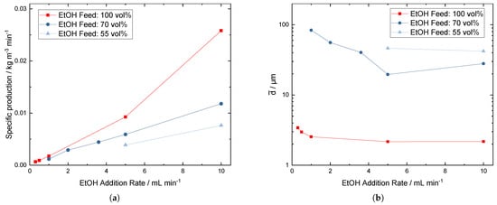 Plotting several selected CSDs from Figure 4 over the ethanol concentration in the feed as shown in Figure 5 shows that the mean diameter increases with an increased dilution for the addition rates of 10 mL min−1 and 5 mL min−1. Crystal growth slightly increases the more the antisolvent is diluted. The mean diameter trend for the lower antisolvent addition rate of 1 mL min−1 shows a larger increase when the antisolvent is diluted compared to the higher addition rates.