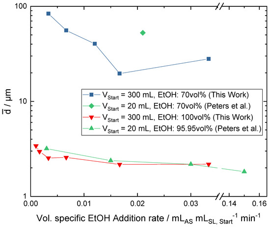 Similar experiments have been published for a smaller setup with approximately 20 mL of starting volume [29], which makes the starting volume of this work with 300 mL 15 times larger. The starting conditions of their solution are comparable to the solution used in this paper. In Figure 11 some of their data are extracted to be compared to data from this work. Peters et al. examined the influence of antisolvent addition from the top or bottom of the vessel. Data from antisolvent addition from the top have been excluded in this comparison since in this work the antisolvent is added exclusively near the stirrer inside the solution. Also, magnetic stirring has been excluded where overhead stirring experiments are available. For pure ethanol addition, Peters et al. only used magnetic stirring and no seeding. Since seeding with experiments of 100 vol% ethanol addition does not influence the CSD as shown in this work, the difference does not harm the comparison. Peters et al. pulled their solid sample at an ethanol concentration of 8 mol L−1. The geometric similarity is not given and the volume-specific power input is not comparable. However, the overall fed-batch setup between both scales is comparable by the volume-specific ethanol addition rate, which is the ethanol addition rate divided by the starting volume. The mean diameters of crystals from experiments with pure ethanol addition in Figure 11 are very similar when compared to the volume-specific ethanol addition rate. This indicates that the mean diameter is scaleable with the starting volume of the crystallizer in the regarded range of volume. For the 70 vol% ethanol addition there is only one experiment of the smaller setup which is comparable to the larger setup. This data point presents a larger mean diameter compared to the larger setup. Larger crystals in this system usually derive from better mixing, so it can be argued that the mixing conditions in the smaller volume are better when the antisolvent is added in a dilution compared to the larger volume crystallizer.