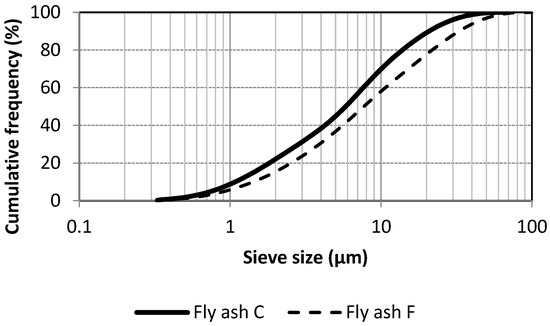 Distribution of particles for low-calcium (Class F) and high-calcium (Class C) fly ash.