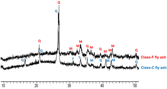 Diffractogram of low- (Class F) and high-calcium (Class C) fly ash. Note: Q, quartz; M, mullite; T, thaumasite.