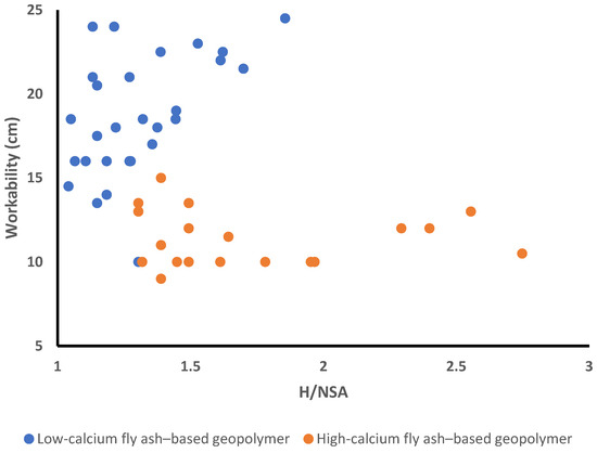The workability of the geopolymer with different H/NSA ratio connections is displayed in Figure 4. Usually, adding more water to the geopolymer-based system will increase the workability of the fresh concrete [25]. This was not the case for the geopolymer mixtures in this study as low H/NSA (range 1–1.5) in the low-calcium fly ash–based geopolymers had high workability, even at a H/NSA less than 2.