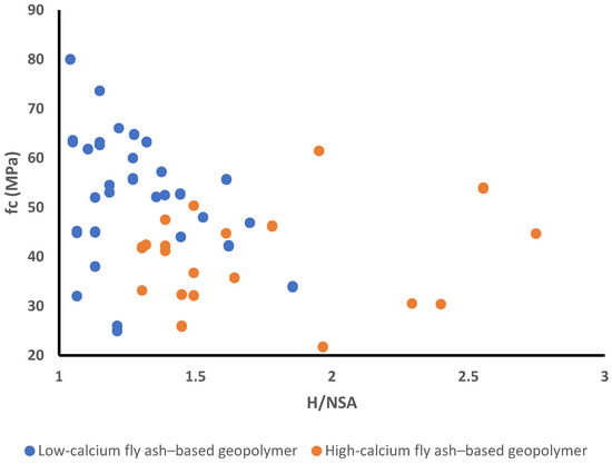 Figure 5 displays the relationship between geopolymer compressive strength and H/NSA ratio. The strength difference mentioned above can be explained by the reaction that occurred in low- and high-calcium fly ash–based geopolymers.