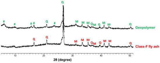 Figure 6 and Figure 7 present the respective diffractograms of Class F fly ash, Class C fly ash, and their associated geopolymerization products. The chemical compositions were analyzed using XPowder Ver. 2004.04.70 Pro software.