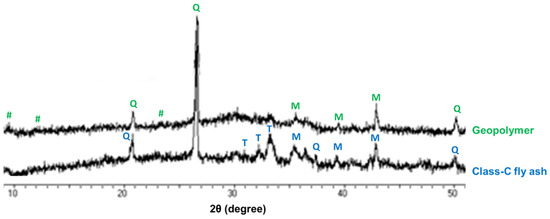 Both fly ashes show the presence of quartz (Q) and mullite (M). These compounds were also reported by Kozhukhova et al. [34]. The calcium-based mineral thaumasite (T) was also present in the Class C fly ash. This result confirmed the high calcium content of the material. However, peak intensity transformed from crystalline to semi-crystalline to amorphous in the geopolymer. The product of both fly ashes contained a sodium silicate hydrate (#) mineral, which confirmed that geopolymerization had occurred.
