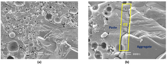 The morphology of geopolymer products with low- and high-calcium fly ash is represented in Figure 10 and Figure 11, respectively. The images show the interfacial transition zone (ITZ), which is a zone around the aggregate [49]. The ITZs experience microcrack formation as a result of the strength variations between the ITZs and the paste and aggregate [50]. The geopolymer with high-calcium fly ash displayed a wider crack distance than the low-calcium fly ash–based geopolymer. Nevertheless, a previous study reported that the geopolymer ITZ has more favorable mechanical properties and a stronger bond than Portland cement–based cementitious material [51].