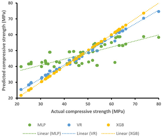 The correlation coefficients for the actual compressive strength versus the predictions made by the MLP, VR, and XGB models (Figure 13) show that the results from the MLP and VR are less accurate than those from the XGB model.