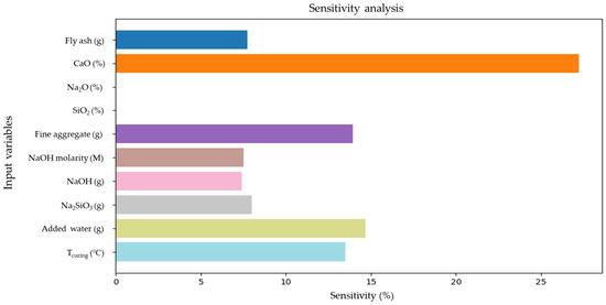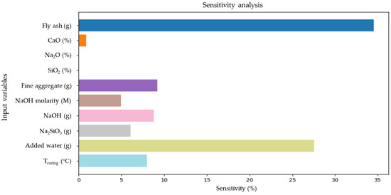 The input parameters that affect geopolymer workability and compressive strength predictions were determined. The desired outcome can be significantly affected by the number of input parameters [52,53]. Our approach reduces network complexity by making it easier to identify the most important input parameters and ignore the less important ones [54]. The sensitivity of the XGB-based prediction model was evaluated to look into the contribution of different independent parameters to compressive strength. Equations (4) and (5) were used to compute the variables’ participation in the models’ outcomes.
