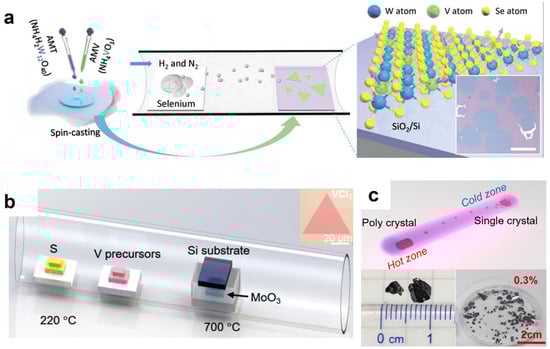 Pristine and doped TMDCs are typically synthesized in two forms: large-area monolayer and bulk single crystals. The former is synthesized by CVD [4,29,31,32,39,53], molecular organic chemical vapor deposition [54,55], and molecular beam epitaxy [56,57,58,59], while the latter is obtained through chemical vapor transport and flux methods [60,61,62,63,64,65,66].