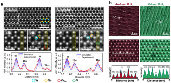 To understand the influence of dopants on the atomic structures of TMDCs, it is crucial to determine their atomic structure after doping. Due to their atomically thin nature, scanning transmission electron microscopy (STEM) allows us to observe the arrangement of atoms on the nanoscale. The STEM technique analyzes the transmitted electrons through an extremely thin sample, creating various intensity profiles based on the elemental wave functions. As a result, the atoms can be identified by their contrast differences in the micrograph. Figure 2a shows the STEM micrographs of pristine and V-doped WSe2 [50]. The brighter spots correspond to W atoms (shown in cyan color in the simulated model), while the Se atoms appear as darker spots (yellow color in the simulated model) compared to W. At the Se spots, the electron beam was transmitted through two Se atoms. Moreover, native Se vacancies can be identified as darker spots at equivalent Se locations. In contrast, the V-doped WSe2 sample shows the V dopants as darker spots at locations equivalent to the W atoms, confirming substitutional doping at the W sites. These V spots appear darker than W due to the V atoms being lighter compared to the W atoms. In addition, the experimental intensity profiles of these elements agree with the simulated intensity profiles, further confirming the atomic structure and the substitutional V dopants in WSe2. In other examples, Re and V substitutional doping in MoS2 (Figure 2b) reflects a similar phenomenon as the V-doped WSe2, except that the Re spots appear brighter than the Mo atoms since Re is heavier than Mo [41]. It is worth noting that Se vacancies persist in both the pristine and the doped TMDCs [36,41,50].