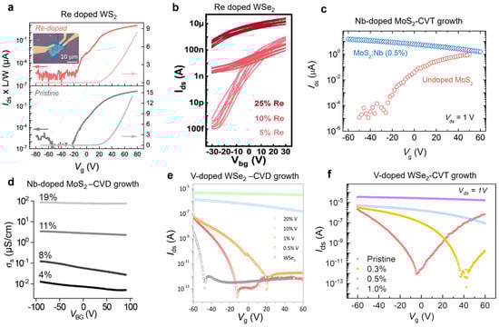 Electronic transport properties. Tunable electrical properties of pristine and doped TMDs grown by CVD and CVT. (a) Typical transport curves of pristine and Re-doped WS2 monolayer FETs (inset, optical image of the device). This figure was adapted with permission from Ref. [71]. 2021, American Chemical Society, Washington, DC, USA. (b) Transport properties of Re-doped WSe2, as concentration increases from 5% to 25% the system enters degenerate state from non-degenerate state. This figure was reprinted with permission from Ref. [41]. 2021, Wiley-VCH GmbH, Weinheim, Germany. (c,d) Typical transport curves of pristine and Nb-doped MoS2. These figures were reprinted with permission from Refs. [27,31]. 2014 & 2020, respectively, American Chemical Society, Washington, DC, USA. (e,f) Transport characteristics of pristine and V-doped WSe2. These figures were adapted with permission from Refs. [36,50]. 2020, WILEY-VCH GmbH & Co. kGaA, Weinheim, Germany and 2021, American Chemical Society, Washington, DC, USA, respectively.
