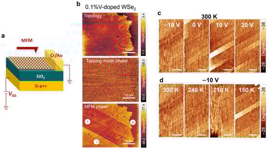 In this context, the strong hybridization at the edge of the valence band with a free hole, induced by the electron transfer from W to V, makes V a crucial dopant for WSe2 [51]. These features lead to strong ferromagnetic exchange interactions and TCs at room temperature. The control of ferromagnetic domains via a gate bias at room temperature was first demonstrated in 0.1% V-doped WSe2 (CVD grown) on a conventional SiO2/Si substrate (Figure 5a) [36]. Magnetic force microscopy (MFM) was used in this experiment. Ferromagnetic domains were identified by detecting the magnetic force between the tip and the stray fields induced by the ferromagnetic domains in the material using a two-path technique [36]. Figure 5b shows micrographs of the topology, the phase contrast from the first-path scan (tapping mode phase), and the phase contrast from the second-path scan (MFM phase contrast). The topology image displays a short dendrite shape of a monolayer (with edges belonging to a multilayer), and no contrast difference is observed in the tapping mode image. However, the phase contrast from the second-path scan reveals the magnetic domains in the monolayer, with multilayer features at the edges of the flake. Furthermore, these magnetic domains can be controlled by applying a gate bias (Figure 5c). At room temperature, the domains exhibit a higher contrast under a positive bias (10 V) and disappear when a negative bias (−10 V) is applied, indicating tunability by an applied bias. To check the tunability of the TC in the ferromagnetic material, the sample was cooled to low temperatures under a negative voltage (−10 V). Ferromagnetic domains appeared at temperatures below 150 K, suggesting that the TC shifts to lower temperatures with a negative bias. Additionally, ferromagnetic features were also confirmed by electrical transport measurements [96].