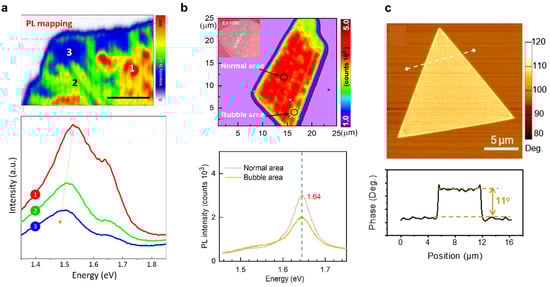 Uniform dopant distribution in TMDCs, illustrated by photoluminescence (PL) mapping of samples. (a,b) PL mapping (top) and the corresponding spectra (bottom) at various spots of V-doped WSe2. These figures were reprinted with permissions from Refs. [36,50]. 2020, WILEY-VCH GmbH & Co. kGaA, Weinheim, Germany and 2021, American Chemical Society, Washington, USA. (c) PL mapping of V-doped MoS2 (top), the line drawn from substrate to flake indicating phase of the PL spectra (bottom). This figure was adapted with permission from Ref. [43]. 2021, American Chemical Society, Washington, USA.