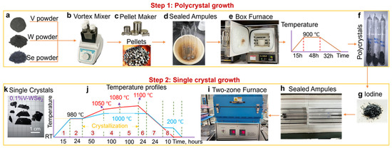 In the chemical vapor transport (CVT) method, the sources are solid. Each element (transition metal, dopant, and chalcogen) is in its purest form. These elements are measured stoichiometrically to their atomic weights, ground together, well-mixed, and sealed in quartz ampules in a strong vacuum (Figure 1c). This method involves vapor transport via a volatile substance called a transport agent, which is non-reactive and easily removed from the bulk crystals after growth. The transport agent is crucial for CVT growth; the type and amount of the transport agent play a critical role in TMDC growth [50,60,67,68,69]. Chlorine, bromine, and iodine are well-known transport agents, with iodine being the most widely used for the growth of TMDCs [67,68,69]. The optimal amount of iodine, 4–6 mg/cm3, worked best in our synthesis of pristine and doped TMDCs. Excess iodine can lead to either quartz ampoule explosions at higher temperatures due to overpressure or cause lattice defects (such as stacking faults) with a low yield (tiny crystals or no crystal) [60,70]. The steps followed in our laboratory for the CVT growth of V-doped WSe2 will be explained in detail in a later section.