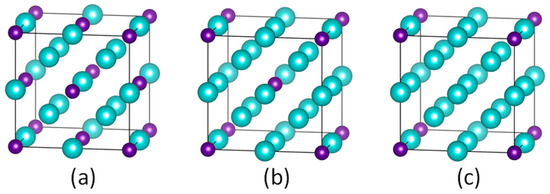 Computational model for ordered substitutional He (small spheres) in Mo (large spheres), forming an fcc (a), bcc (b), or simple cubic (c) superlattice. The (2 × 2 × 2) host supercells are taken as an example.