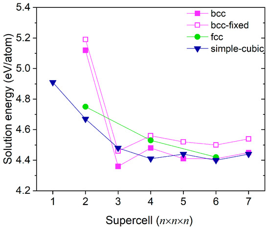 The solution energy of substitutional He in Mo supercells. The concentration of He is 1/n3, 2/n3, and 4/n3 for simple cubic, bcc, and fcc He superlattices.