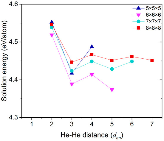 The solution energy (eV/atom) of a He pair in <111> direction in a (m × m × m) Mo supercell (m = 5, 6, 7, 8) at various Mo-Mo distances (at the scale of the Mo-Mo bond length dnn).