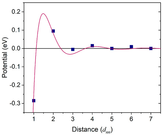 We have also studied He-He interactions at short ranges in the case of low concentrations by evaluating the solution energy of a He pair. We have varied the He-He distance in (5 × 5 × 5), (6 × 6 × 6), (7 × 7 × 7), and (8 × 8 × 8) Mo supercells embedded with two substitutional He atoms sitting along the <111> direction. The corresponding He concentrations in these settings are 1/125 (0.8%), 1/216 (0.5%), 1/343 (0.3%), and 1/512 (0.2%), respectively. The calculated solution energy per He atom in each supercell as a function of He-He distance is shown in Figure 3. Very similar to the results displayed in Figure 2 (solid squares), we see clear oscillations of the He-He interactions at low concentrations. The magnitude of oscillation is smaller than that in the high concentration case, as the number of nearest He neighbors is only two, while it is eight in the former case. To better illustrate a specific He-He interaction, we display it in the form of He-He interatomic potential in the (8 × 8 × 8) Mo supercell, as shown in Figure 4. Note that the potential is assumed, as an approximation, to fade to zero at a He-He distance of seven times the Mo-Mo bond length. Such an interatomic potential can be fairly fitted as , in which is the He-He distance. Clearly, this equation is very different from that in a vacuum where there are no oscillations [19].