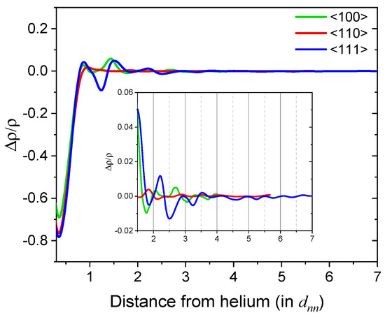 where is the Fermi wavevector of the electron gas in the host metal and is the phase shift accounting for the electron transfer between the impurity and the host. The discrete nature of the crystal lattice means that Friedel oscillations are orientation-dependent in real metals, following the Fermi wavevector variation [27]. Keeping in mind that He prefers a low-electron-density environment when substituting for a matrix atom, we are more interested in the electron density variation along atomic chains containing the He atom. We have chosen three low-index directions, <100>, <110>, and <111>, and calculated the relative change in charge density along these three directions upon replacing one Mo atom with an He atom.