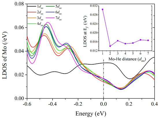 To gain deeper insights into the oscillations in the charge density, we have calculated the local density of states (LDOS) of Mo atoms at varying distances from the embedded He along the <111> direction in the (7 × 7 × 7) supercell. It is seen clearly in Figure 6 that the LDOS of a certain Mo atom changes remarkably with the Mo-He distance i.e., the number of matrix atoms in between the two, and the perturbation effect of He on the electronic structure has a long-range nature. In the inset, we show the calculated LDOSs of Mo atoms at the Fermi energy level, which makes the major contribution to the electron density in the interstitial region. It is found that with increasing distance from the He atom, the LDOSs of Mo atoms oscillate in a similar manner to the charge density; this result is a strong manifestation of the Friedel oscillation.