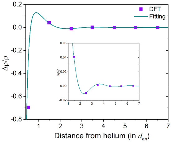 We note that Equation (2) only holds for large r, so it is not unexpected that the He-induced Friedel oscillations in Mo do not follow the analytical form exactly. The absence of a phase shift is mainly due to the chemical inertness of He, which prevents charge transfer between He and its surrounding atoms. The wavelength of oscillations is approximately 2.5 dnn, which is approximately 6.8 Å smaller than that estimated from the Fermi velocity of Mo (0.92 × 106 m/s), 7.9 Å. The reason for such a discrepancy implies that d electrons in transition metals cannot be described properly by the jellium model as s electrons in simple metals.