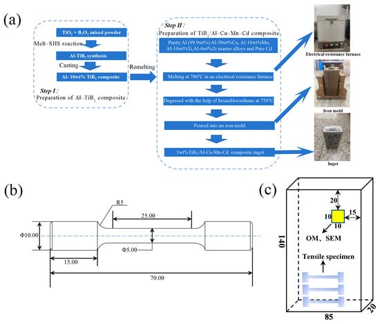The composite was prepared by a combination of melt self-spreading reaction (Melt-SHS) and traditional casting. The Melt-SHS method [] via mixed TiO2 and H3BO3 in molten Al was employed to prepare in situ Al-10 wt%TiB2 master alloy, and 1 wt%TiB2/Al–Cu–Mn–Cd composite was prepared by traditional casting. The preparation process diagram for composite is displayed in Figure 1a. A total of 1000 g of alloy was produced at 780 °C in an electric resistance furnace. We used 99.99 wt% pure aluminum, master alloys such as Al-50wt%Cu, Al-10wt%Mn, Al-10wt%Ti, Al-4wt%Zr and Al-10wt%TiB2 and cadmium metal (99.9%) for this process. Post processing involved hexachloroethane degassing at 750 °C to remove any impurities. Alloy was successfully poured into an iron mold pre-heated at 730 °C and coated with a blend of zinc oxide and sodium silicate in water. To acquire the actual mass fraction of TiB2 in the composite, TiB2 particles were extracted from TiB2/Al–Cu–Mn–Cd composite. The detailed process was as described below. We gently sliced a petite sample measuring 10 mm × 10 mm × 5 mm. This was then immersed in a dilute hydrochloric acid solution until fully dissolved. Next, the particles were isolated via centrifugation, suction filtration and multiple cycles of treating with ionized water. Finally, the particles were dried in an oven at 50 °C for 24 h. The morphology of extracted TiB2 particles exhibited regular polyhedra, and the equivalent average diameter was 0.75 μm, as displayed in Figure S1. The weights of TiB2 particles and the small bulk specimen were measured by analytical balance, and the ratio of the two masses was considered to be the actual mass fraction of the TiB2 particles in the composite. The chemical composition of experimental composite is shown in Table 1, which was confirmed by inductively coupled plasma atomic emission spectroscopy (ICP).