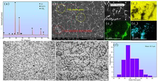 Figure 2 shows the microstructure of the as-cast TiB2/Al–Cu–Mn–Cd composite and the XRD pattern. The as-cast microstructure mainly contained α (Al) matrix, eutectic-phase Al2Cu and TiB2 phase, as displayed in Figure 2a. Due to low content of the microalloying elements, other phases containing microalloying elements such as Mn, Ti, Cd et al. could not be observed. As shown in Figure 2b,c, the as-cast microstructure of the composite was mainly composed of α (Al) matrix and eutectic-phase Al2Cu at the grain boundary. Specifically, most of the Mn and Cd elements were saturated in the Al matrix and precipitated in the aging process. In addition, most of the TiB2 particles were located within the α (Al) grain (marked with dotted yellow circles), and part of the TiB2 particles were distributed along the grain boundary (marked with a dotted red circle). The EDS mapping showed that the TiB2 particles distributed in the grain boundary coexisted with eutectic-phase Al2Cu, as displayed in Figure 2c–c3. Figure 2d,e show the as-cast grain morphology and size, and the composite exhibited fine equiaxed morphology. As displayed in the partially enlarged image, Figure 2e shows that the grain where the TiB2 particles existed was finer compared to the grain without TiB2 (marked by a dotted white circle), indicting that TiB2 enhanced the grain refinement. By grain-size statistics, the as-cast grain size of the TiB2/Al–Cu–Mn–Cd composite was 42.3 μm, as displayed in Figure 2f.