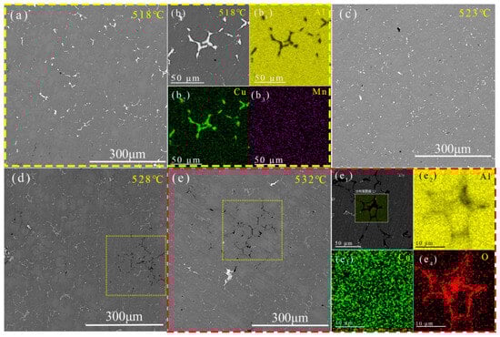 Microstructure evolution of TiB2/Al–Cu–Mn–Cd composite heated at different temperatures for 12 h and EDS mapping results: (a,b) 518 °C, (b–b3) EDS mapping result of residual phase; (c) 523 °C; (d) 528 °C; (e) 532 °C, (e–e4) EDS mapping result of over-burning defects.
