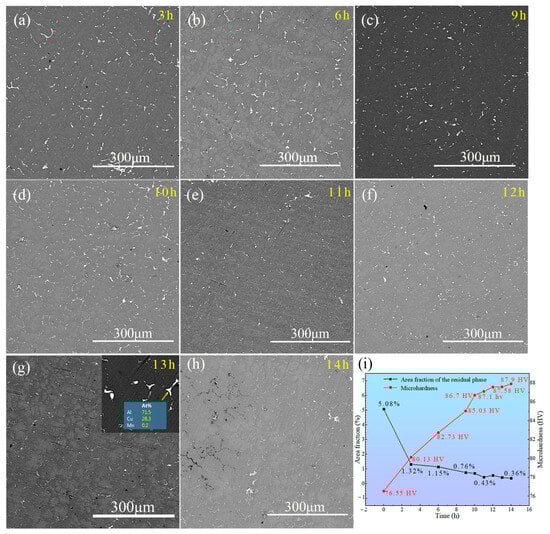 Microstructure evolution of TiB2/Al–Cu–Mn–Cd composite heated at 523 °C for various periods (3–14 h): (a) 3 h; (b) 6 h; (c) 9 h; (d) 10 h; (e) 11 h; (f) 12 h; (g) 13 h; (h) 14 h; (i) the statistics for area fraction of residual phase and microhardness in the solution process.